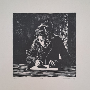 Ik werk met hoogdruk: handmatig gesneden ontwerpen in linoleum of hout, ontstaan vanuit een zorgvuldig creatief proces.